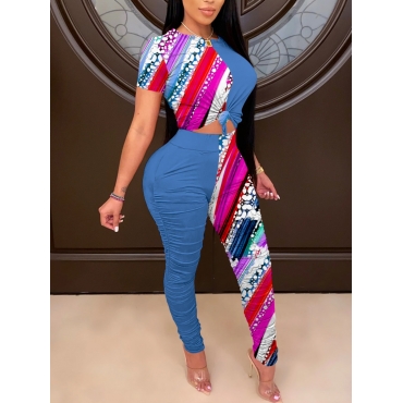 Lovely Trendy O Neck Print Patchwork Blue Two Piece Pants Set