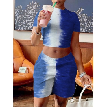 Lovely Casual O Neck Tie Dye Blue Two Piece Shorts Set