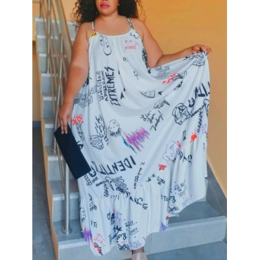 Lovely Casual Letter Print Flounce Design White Floor Length A Line Plus Size Dress
