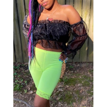 Lovely Chic Off The Shoulder See-through Fold Design Black Two Piece Shorts Set