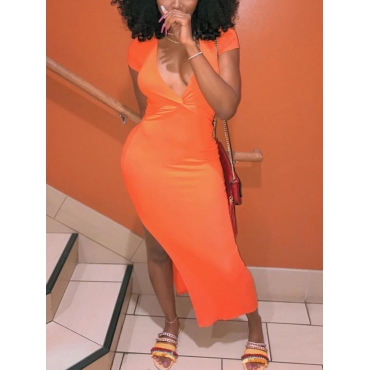 Lovely Casual V Neck Side Split Orange Ankle Length Dress