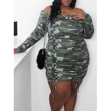 Lovely Casual Off The Shoulder Camo Print Drawstring Mini Plus Size Dress