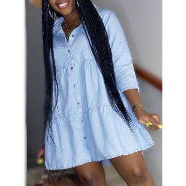 Lovely Casual Button Ruffle Design Loose Baby Blue Mini Denim Dress