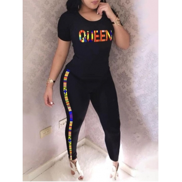 Lovely Trendy Letter Print Striped Black Two Piece Pants Set