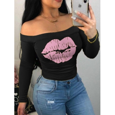 Lovely Casual Off The Shoulder Lip Print Black T-shirt