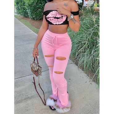 Lovely Street Off The Shoulder Lip Print Ripped Pink Two Piece Pants Set