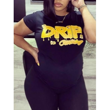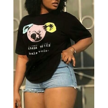 Lovely Casual O Neck Cartoon Letter Print Black T-shirt