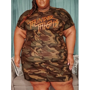 Lovely Casual O Neck Letter Camo Print Knee Length Plus Size Dress