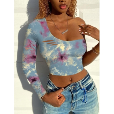 Lovely Chic One Shoulder Tie-dye Ripped Blue T-shirt(No-positioning Printing)