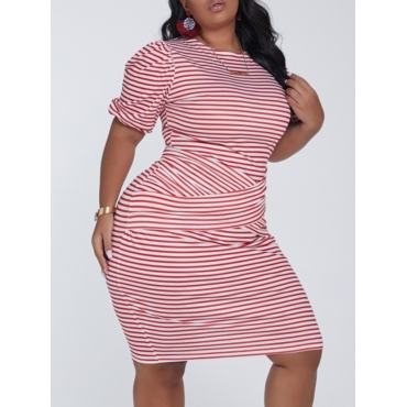 Lovely Casual O Neck Striped Cross-over Design Red Knee Length Plus Size Dress