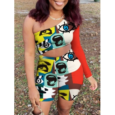 Lovely Chic One Shoulder Eye Print Patchwork Red Two Piece Shorts Set