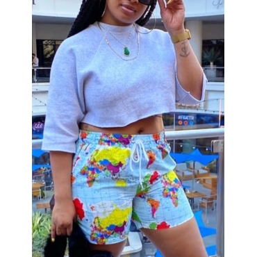Lovely Casual Graffiti Print Drawstring Grey Two Piece Shorts Set