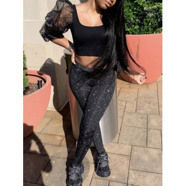 Lovely Sweet Ruffle Design Mesh Patchwork Black Two Piece Pants Set