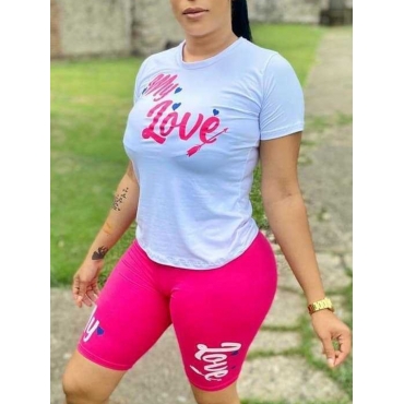 Lovely Casual O Neck Letter Print Rose Red Two Piece Shorts Set