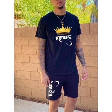 Lovely Casual Crown Letter Print Black Men Two Piece Shorts Set