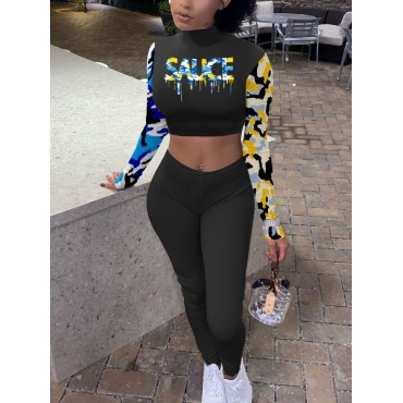Lovely Street Letter Camo Print Black Two Piece Pants Set