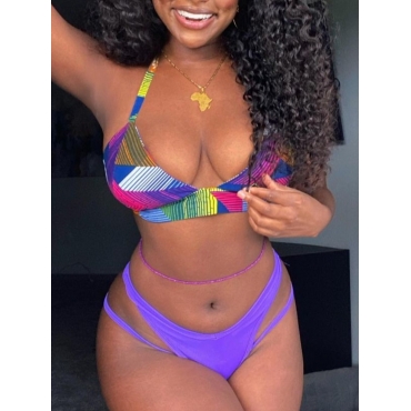 Lovely Casual Hollow-out Print Patchwork Purple Two-piece Swimsuit