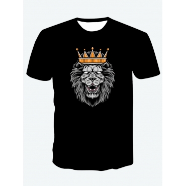 Lovely Casual O Neck Lion Print Black Men T-shirt