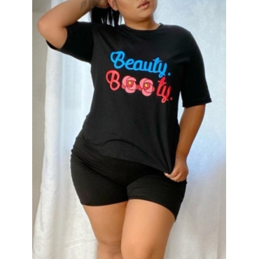 Lovely Casual O Neck Letter Print Black Plus Size Two-piece Shorts Set