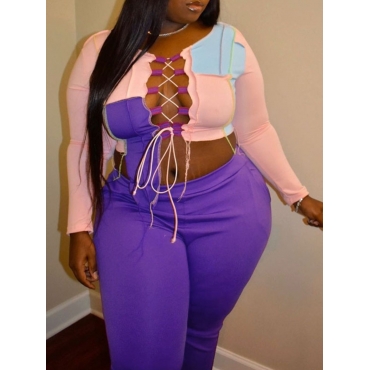 Lovely Casual Bandage Hollow-out Design Purple Plus Size Two-piece Pants Set
