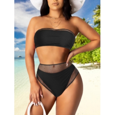 Lovely Casual Off The Shoulder See-through Patchwork Black Two-piece Swimsuit