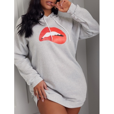Lovely Casual Hooded Collar Lip Print Grey Mini Dress