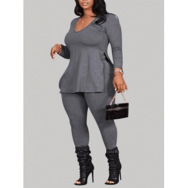Lovely Casual V Neck Long Sleeve Grey Plus Size Two-piece Pants Set