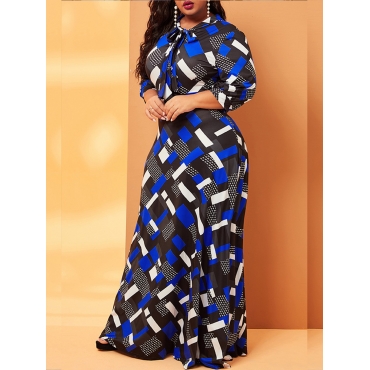 Lovely Formal Geometric Print Patchwork Blue Floor Length A Line Plus Size Dress