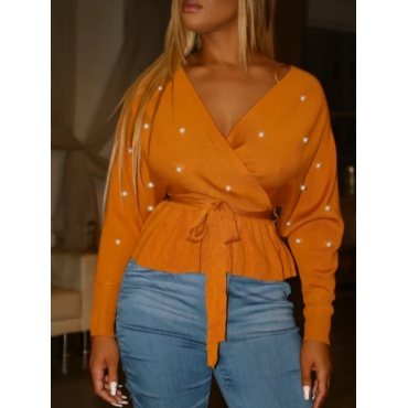 Lovely Trendy V Neck Pearl Decorative Fold Design Croci Sweater