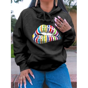 Lovely asual Lip Print Kangaroo Pocket Black Hoodie