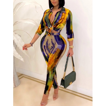 Lovely Trendy Turndown Collar Print Yellow Two Piece Pants Set