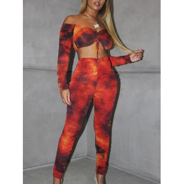 Lovely Casual Off The Shoulder Tie Dye Print Orange Red Two Piece Pants Set
