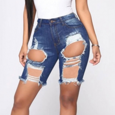 Lovely Casual High-waisted Broken Holes Deep Blu Denim Shorts