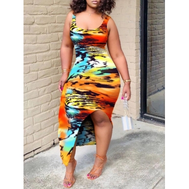 Lovely Trendy U Neck Print Orange Ankle Length Dress