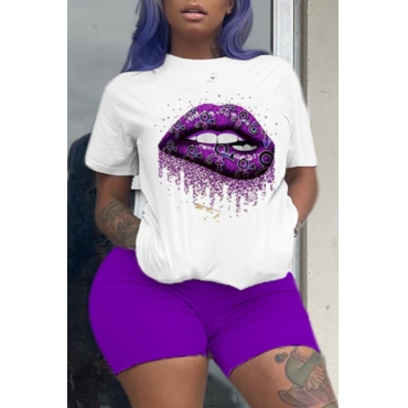 Lovely Casual Lip Print Purple Plus Size Two-piece Shorts Set