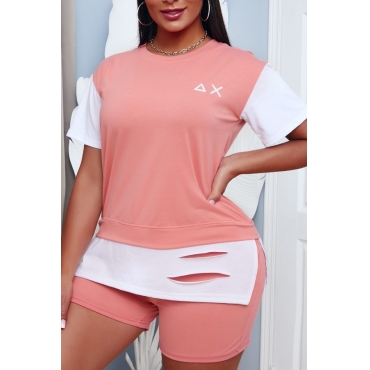 Lovely Leisure O Neck Patchwork Pink Two-piece Shorts Set