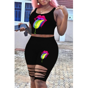 Lovely Casual Lip Print Black Two-piece Shorts Set