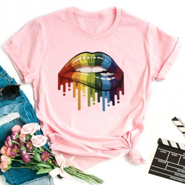 Lovely Casual O Neck Lip Print Pink T-shirt