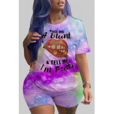 Lovely Casual Lip Print Purple Plus Size Two-piece Shorts Set
