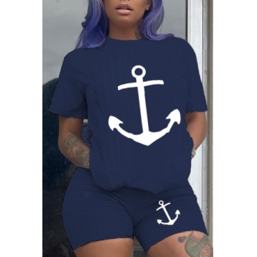 Lovely Casual O Neck Print Blue Two-piece Shorts Set