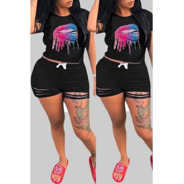 Lovely Casual Lip Print Black Plus Size Two-piece Shorts Set