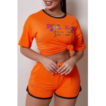Lovely Leisure Letter Print Orange Two-piece Shorts Set