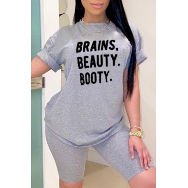 Lovely Casual Letter Print Grey Two-piece Shorts Set