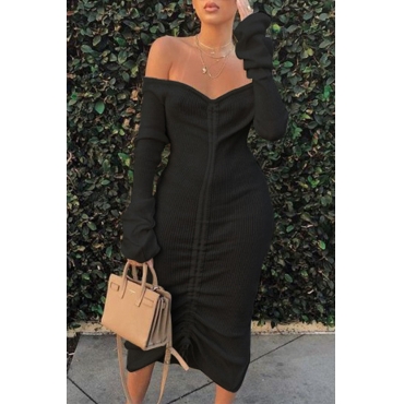 Lovely Trendy Dew Shoulder Black Mid Calf Dress