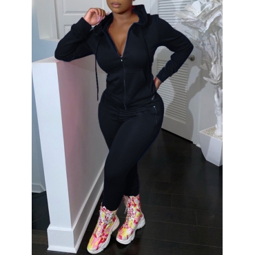 Lovely Casual Hooded Collar Zipper Design Black Two Piece Pants Set