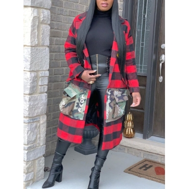 Lovely Stylish Turndown Collar Grid Print Red Long Trench Coat