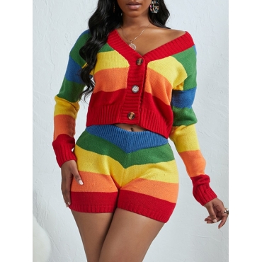 Lovely Stylish V Neck Rainbow Striped Multicolor Two Piece Shorts Set