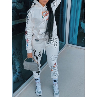 Lovely Sportswear Hooded Collar Print White Plus Size Two-piece Pants Set