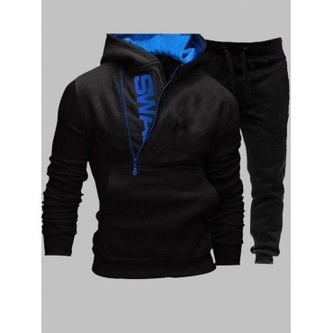 Lovely Sportswear Hooded Collar Letter Zipper Design Black Men Two-piece Pants Set