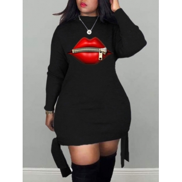 Lovely Leisure O Neck Lip Print Black Mini Dress